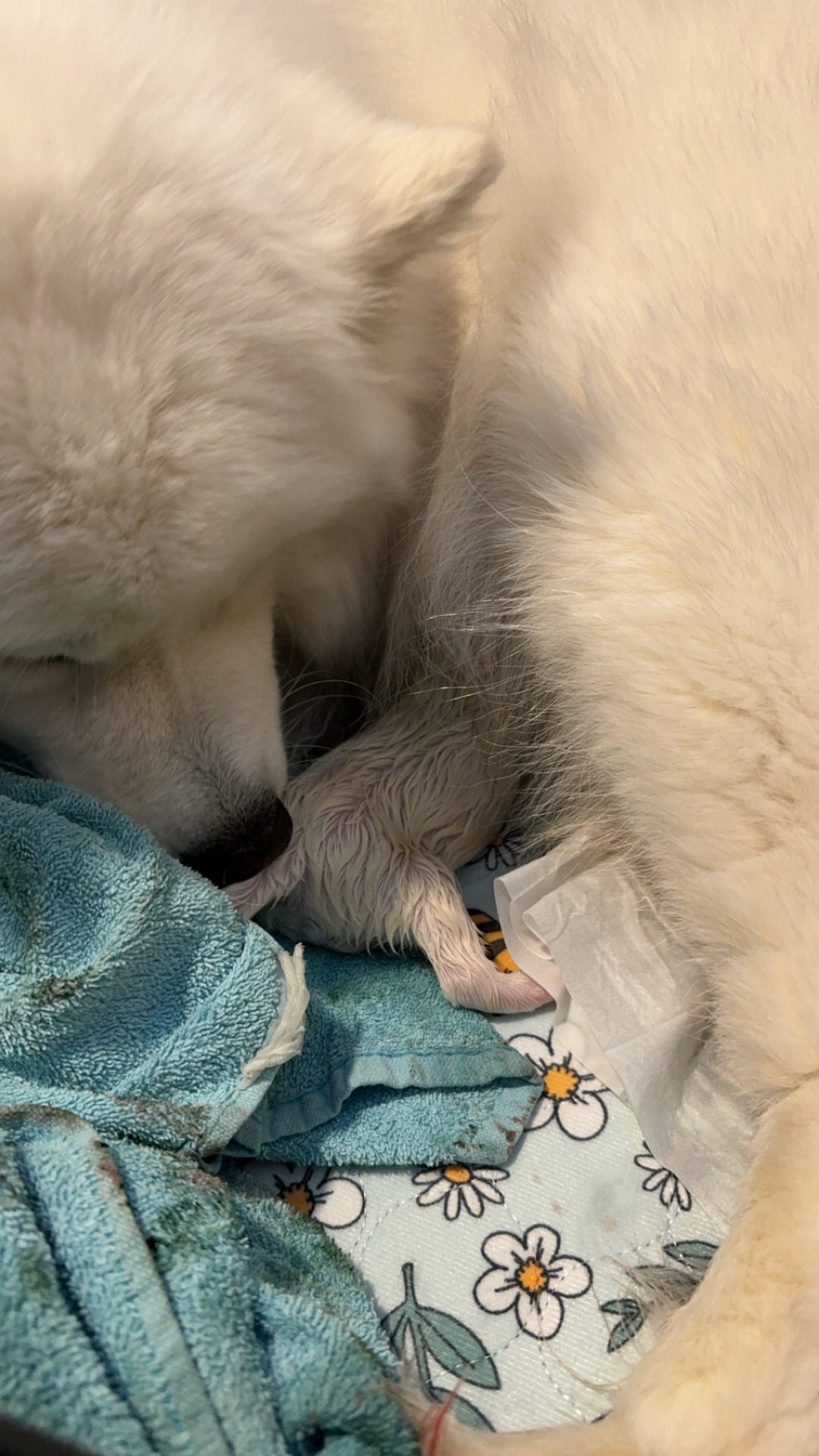 Kaikki sujui kuitenkin kuin lähes oppikirjasta. Sunnuntai-iltana Lumos kieltäytyi syömästä ja teki aktiivisesti pesää pentulaatikkoon. Sunnuntai-maanantai välisenä yönä puolen yön aikaan alkoi selvästi avautumisvaihe, Lumos oli koko yön levoton, läähätti ja herätteli vähän väliä, kun tarvitsi tukea ja rakkautta. Ja vaikka kaikista ennakko-oletuksista huolimatta povattiin yösynnytystä, sitä ei kuitenkaan tapahtunut.